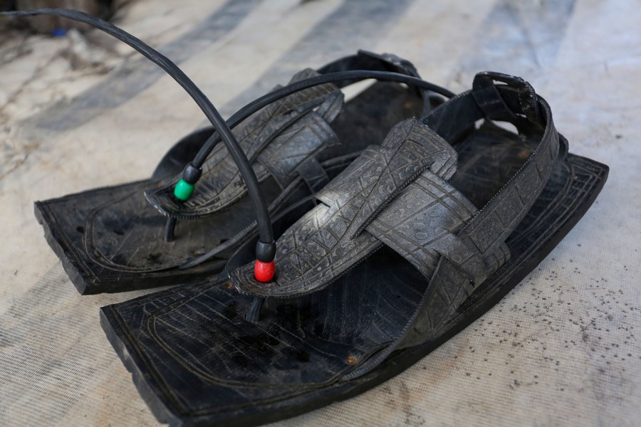 A pair of sandals locally known as "Katambuga" made from recycled tires are pictured at a street workshop in Dar es Salaam, Tanzania, Feb. 16, 2024. (Photo by Herman Emmanuel/Xinhua)