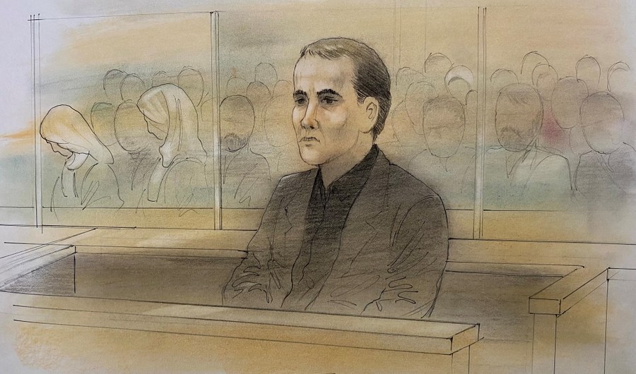 Nathaniel Veltman, 23, sits in the prisoner box at the courthouse in London, Ontario, Canada, on Feb. 22, 2024. (Sketch credit: CTV News)