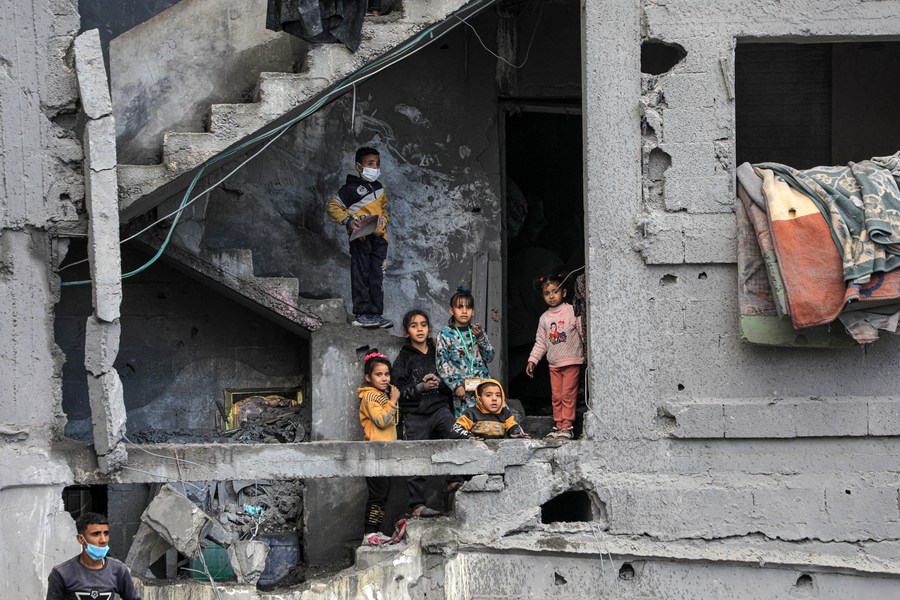 Children are seen in a building destroyed in an Israeli air strike in the southern Gaza Strip city of Rafah, Feb. 22, 2024. (Photo by Rizek Abdeljawad/Xinhua)