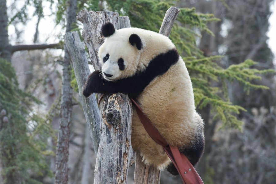 Giant panda You You has fun at Zoo Aquarium in Madrid, Spain, March 7, 2023. (Photo by Gustavo Valiente/Xinhua)