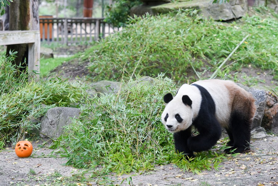 Giant panda Bing Xing walks toward a pumpkin filled with food during a Halloween celebration in Madrid Zoo Aquarium in Madrid, Spain, Oct. 26, 2023. (Photo by Gustavo Valiente/Xinhua)
