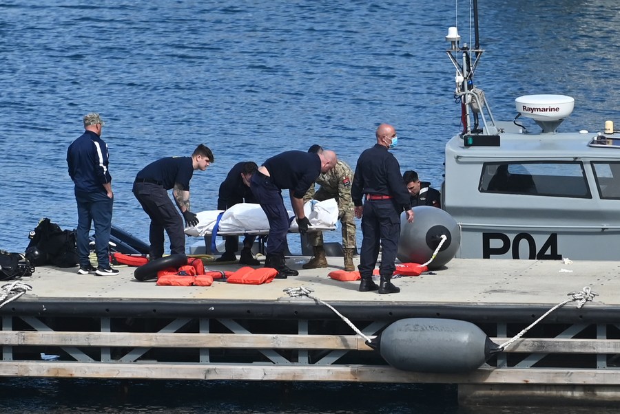 Rescuers carry the corpse of a migrant in Pieta, Malta, on Feb. 23, 2024. (Photo by Jonathan Borg/Xinhua)