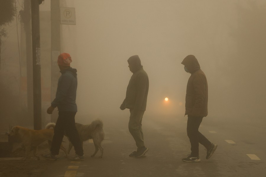 People walk on a fog-shrouded street in Kathmandu, Nepal, Feb. 23, 2024. (Photo by Sulav Shrestha/Xinhua)