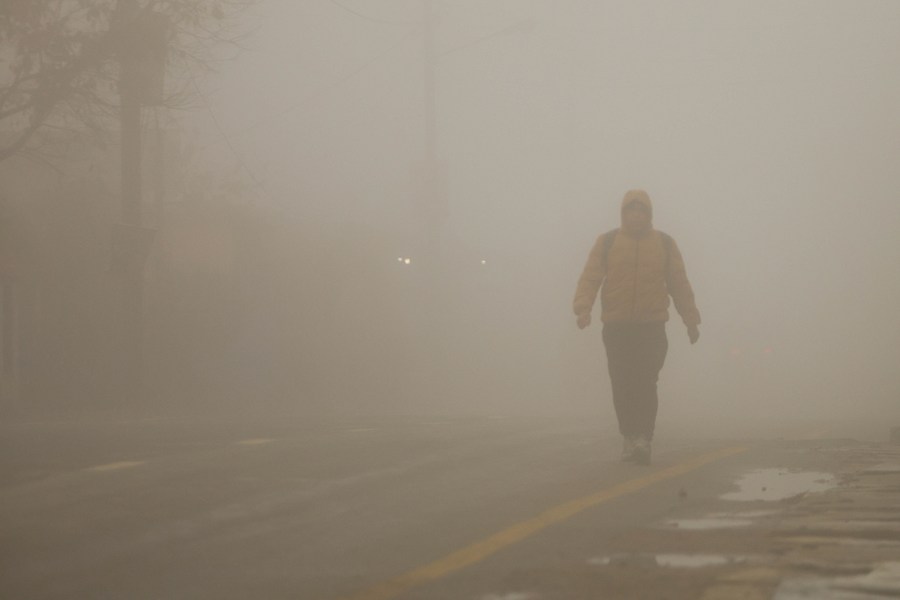 A person walks on a fog-shrouded street in Kathmandu, Nepal, Feb. 23, 2024. (Photo by Sulav Shrestha/Xinhua)