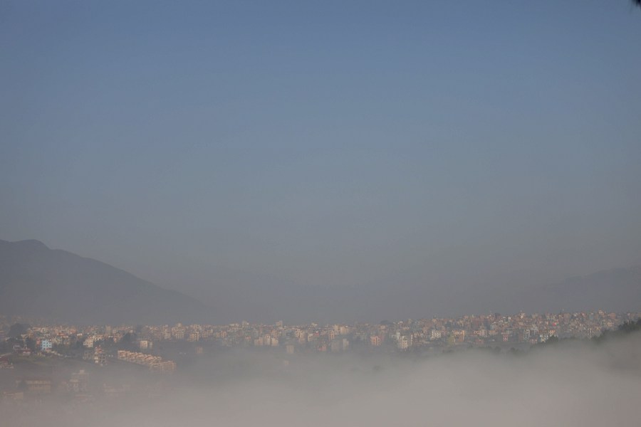 Buildings are seen shrouded in fog in Kathmandu, Nepal, Feb. 23, 2024. (Photo by Sulav Shrestha/Xinhua)
