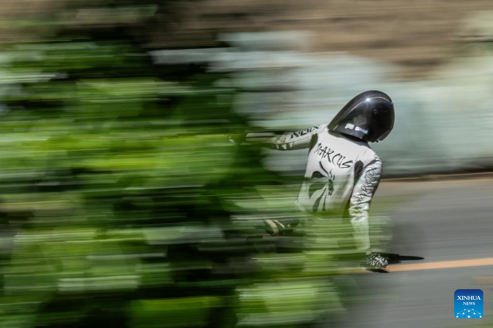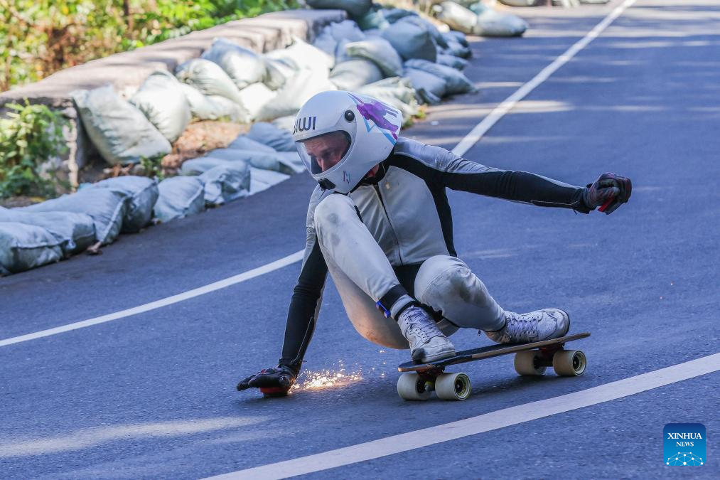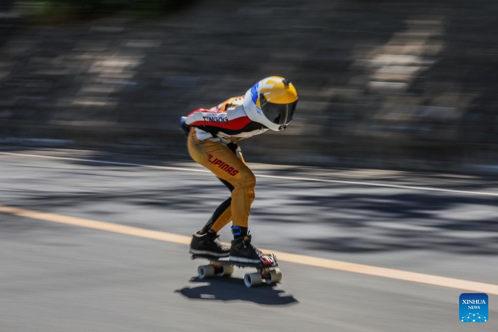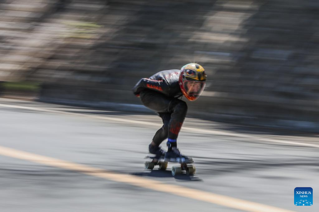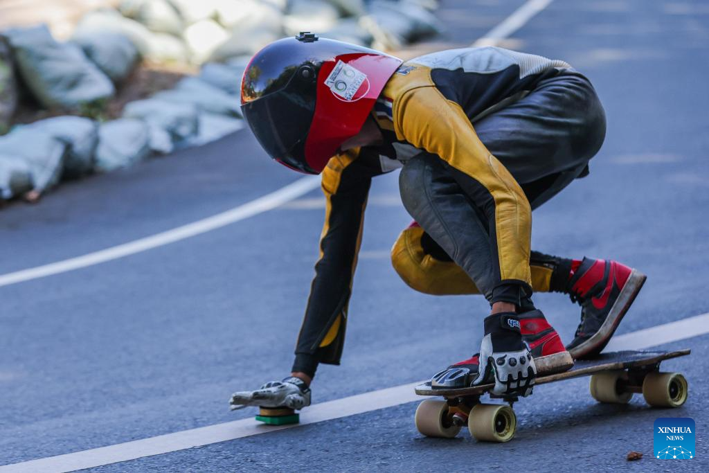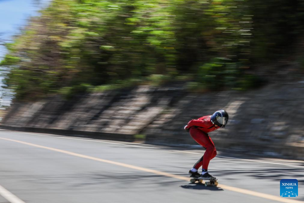 Italy's Marcus Aldinucci competes during the 1st round of the men's skateboarding at the Downhill Skateboarding and Street Luge World Championships in Cavite Province, the Philippines, on Feb. 24, 2024. (Xinhua/Rouelle Umali)