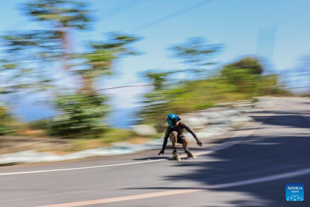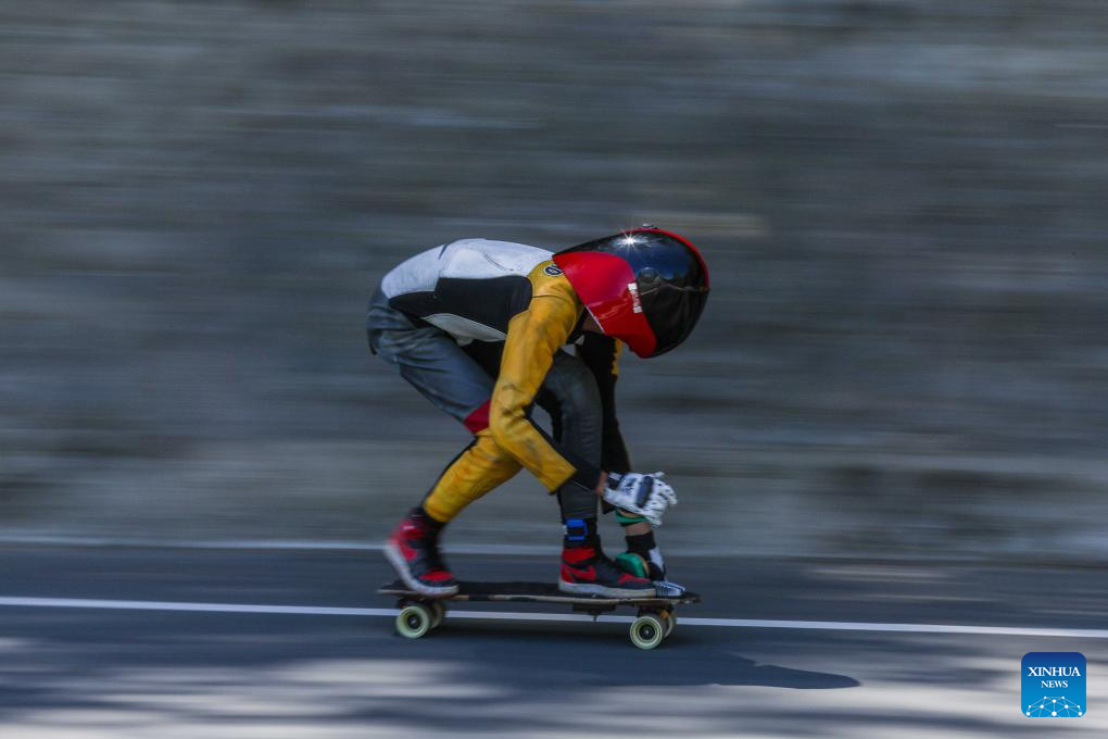 Italy's Stefano Barbizzi competes during the 1st round of the men's skateboarding at the Downhill Skateboarding and Street Luge World Championships in Cavite Province, the Philippines, on Feb. 24, 2024. (Xinhua/Rouelle Umali)