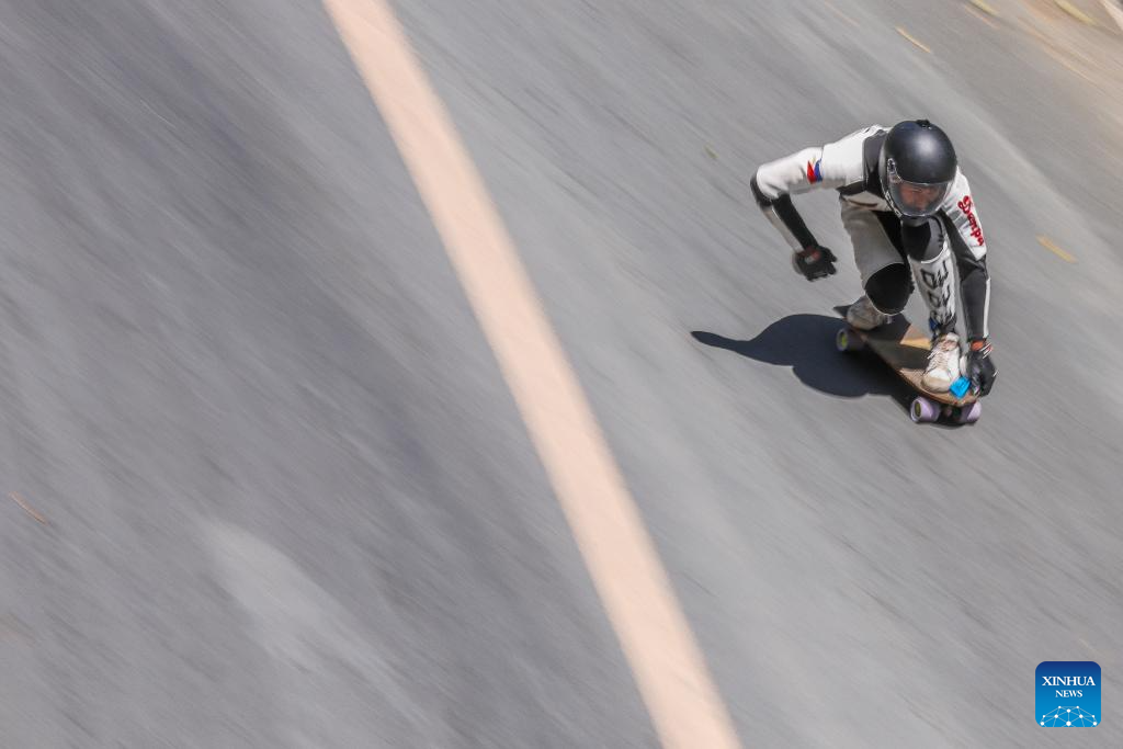 Switzerland's Gregoire Schwab competes during the 1st round of the men's skateboarding at the Downhill Skateboarding and Street Luge World Championships in Cavite Province, the Philippines, on Feb. 24, 2024. (Xinhua/Rouelle Umali)