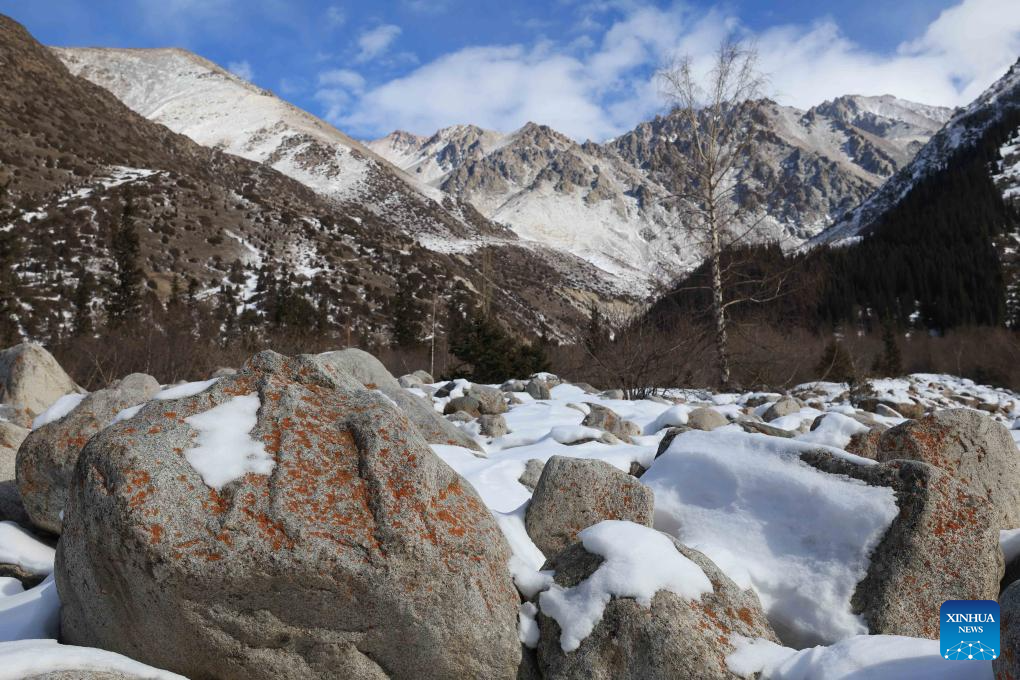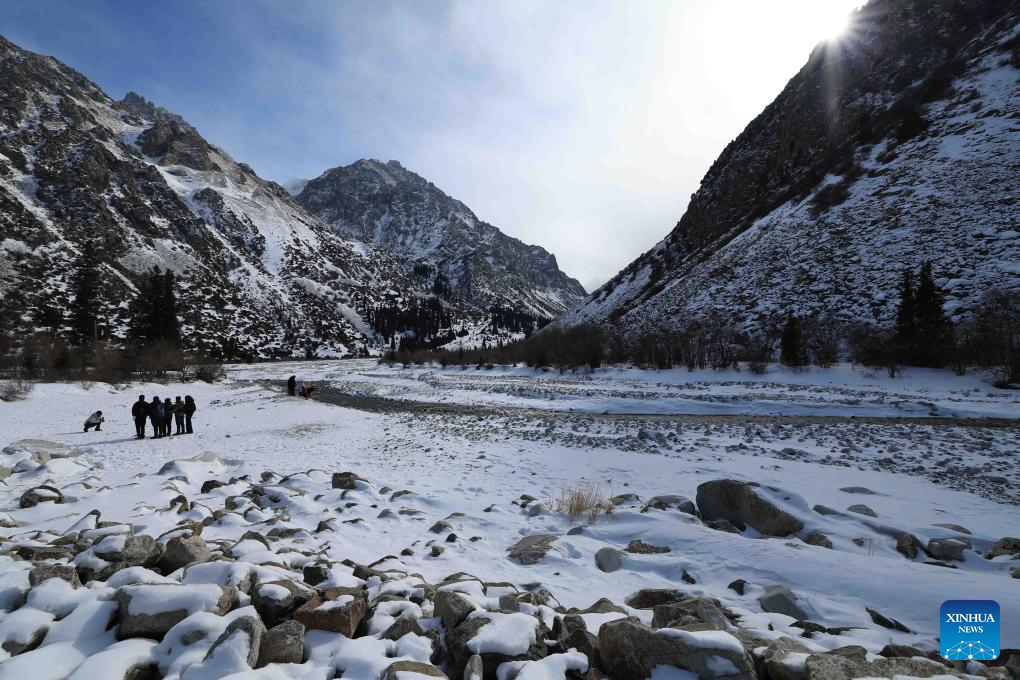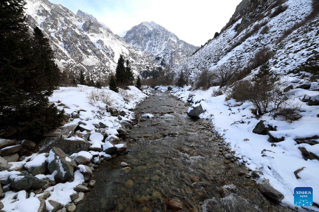 This photo taken on Feb. 23, 2024 shows a winter scenery at Ala-Archa National Park, some 30 kilometers away from Bishkek, capital of Kyrgyzstan. (Photo by Roman/Xinhua)
