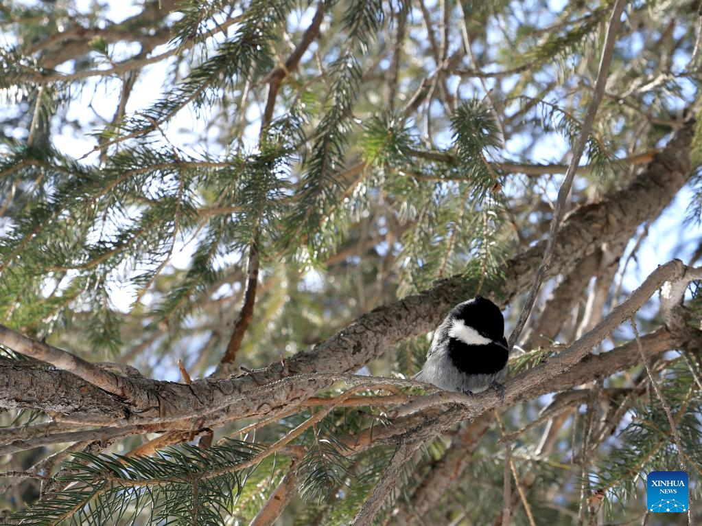 A bird perches on a tree branch at Ala-Archa National Park, some 30 kilometers away from Bishkek, capital of Kyrgyzstan, Feb. 23, 2024. (Photo by Roman/Xinhua)