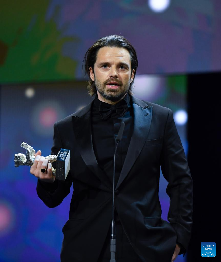 Actor Sebastian Stan speaks after receiving the Silver Bear for Best Leading Performance during the 74th Berlin International Film Festival in Berlin, Germany, Feb. 24, 2024. (Xinhua/Ren Pengfei)