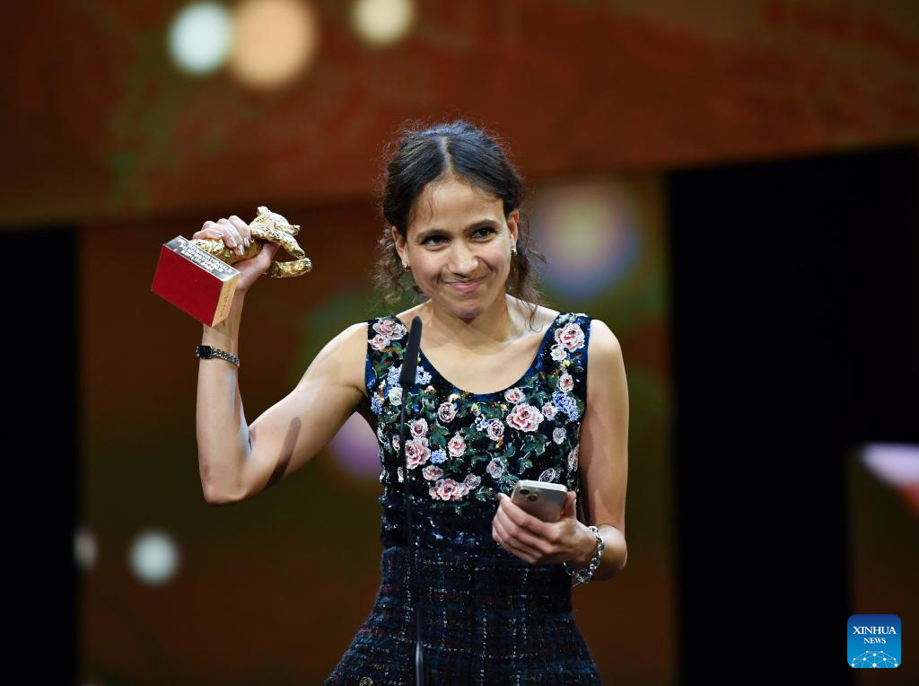 Director Mati Diop speaks after receiving the Golden Bear for Best Film during the 74th Berlin International Film Festival in Berlin, Germany, Feb. 24, 2024. (Xinhua/Ren Pengfei)