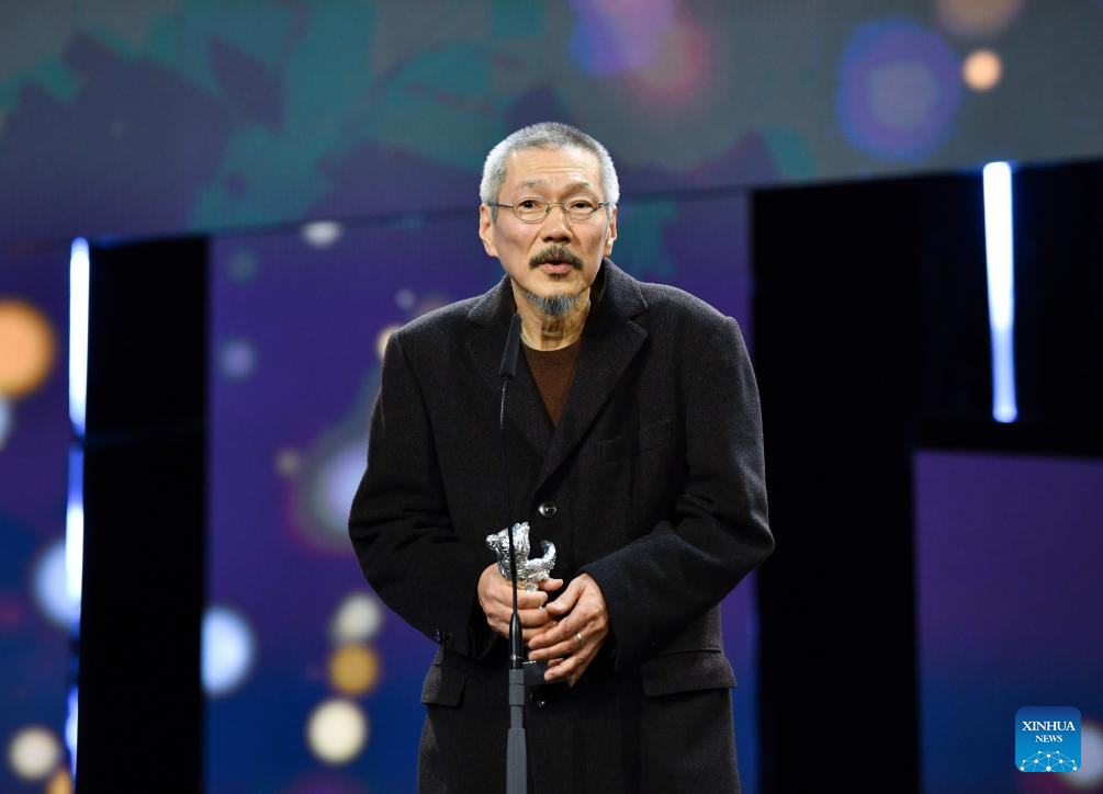 Director Hong Sangsoo speaks after receiving the Silver Bear Grand Jury Prize during the 74th Berlin International Film Festival in Berlin, Germany, Feb. 24, 2024. (Xinhua/Ren Pengfei)