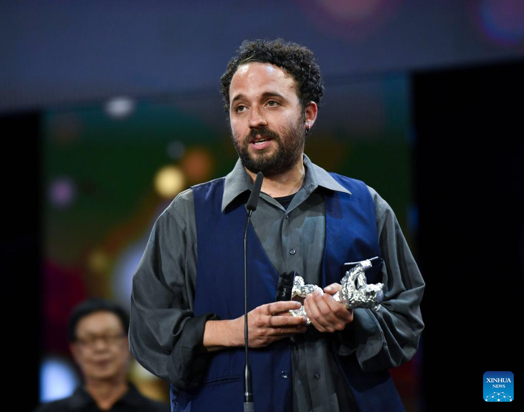 Director Nelson Carlos De Los Santos Arias speaks after receiving the Silver Bear for Best Director during the 74th Berlin International Film Festival in Berlin, Germany, Feb. 24, 2024. (Xinhua/Ren Pengfei)