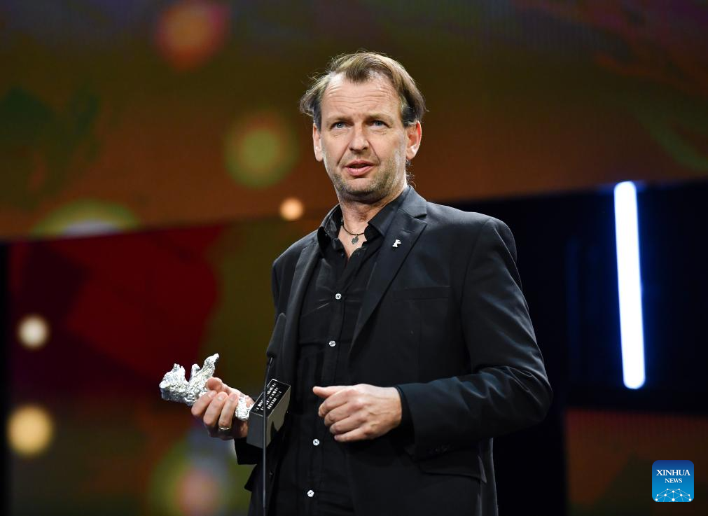 German director Matthias Glasner speaks after receiving the Silver Bear for Best Screenplay during the 74th Berlin International Film Festival in Berlin, Germany, Feb. 24, 2024. (Xinhua/Ren Pengfei)