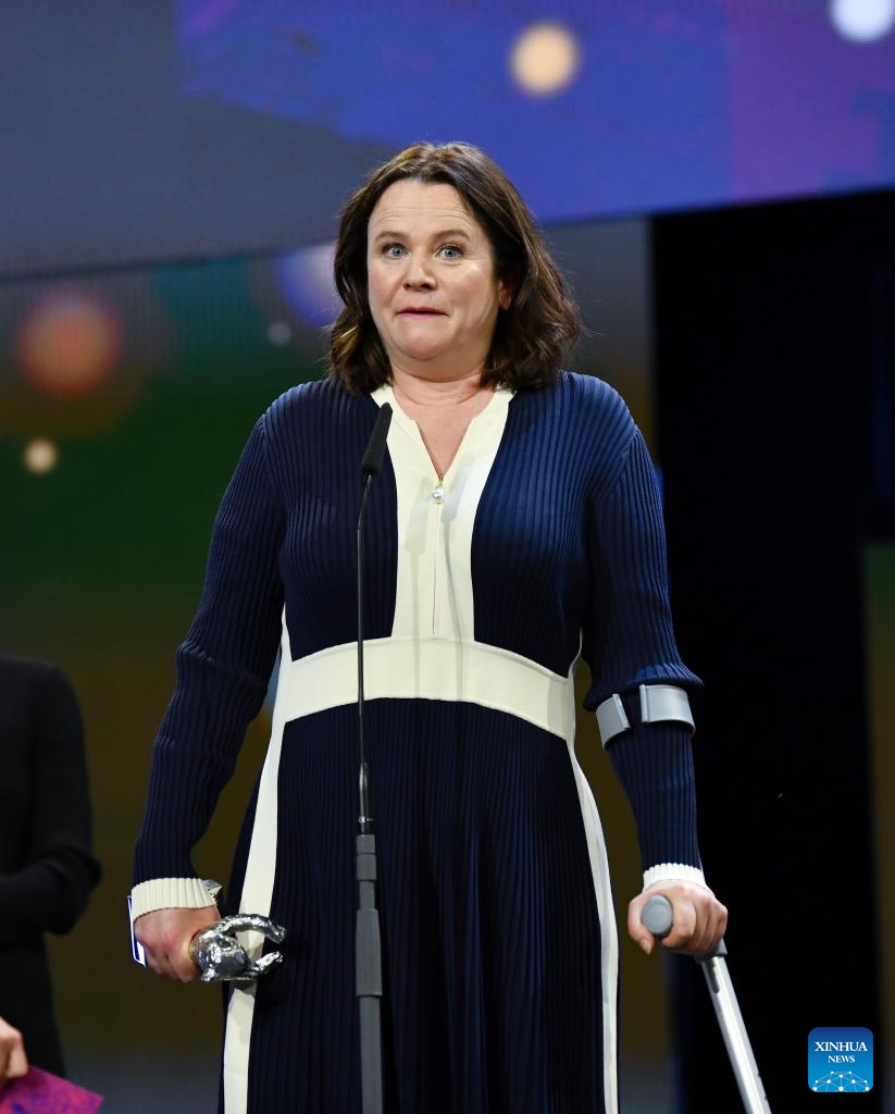 Emily Watson speaks after receiving the Silver Bear for Best Supporting Performance for "Small Things Like These" during the 74th Berlin International Film Festival in Berlin, Germany, Feb. 24, 2024. (Xinhua/Ren Pengfei)