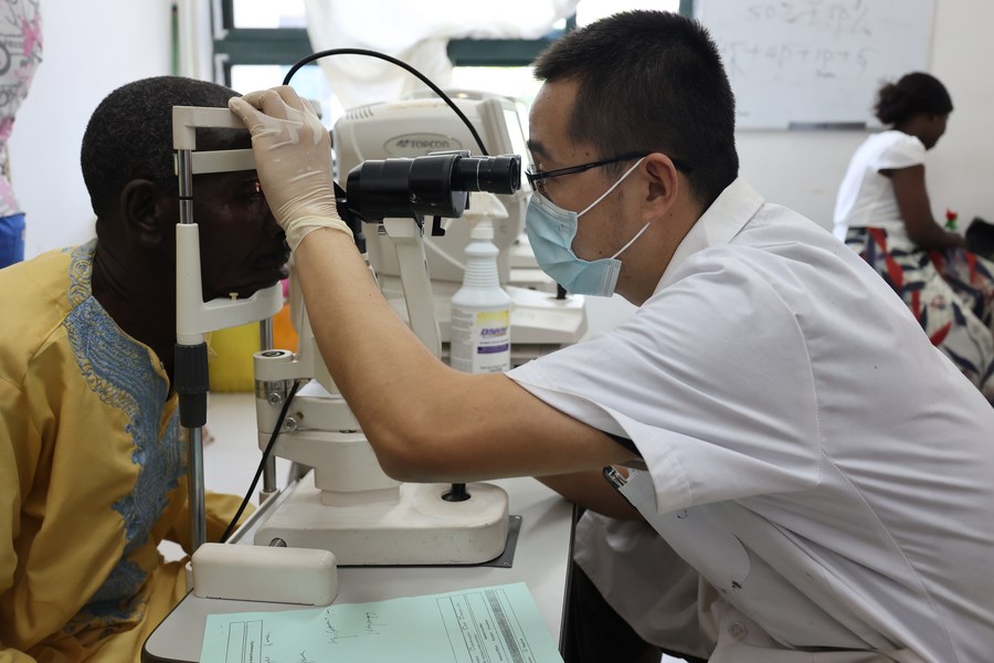 A Chinese doctor checks on a local patient at the Sierra Leone-China Friendship Hospital in Jui, a town in the suburb of Freetown, Sierra Leone, on Feb. 22, 2024. (Xinhua/Xu Zheng)
