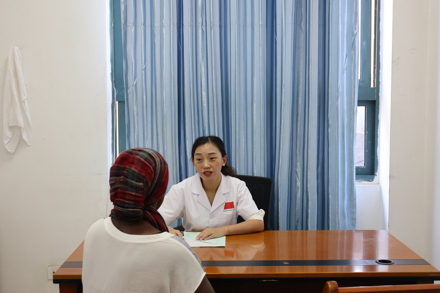 A Chinese doctor speaks with a local patient at the Sierra Leone-China Friendship Hospital in Jui, a town in the suburb of Freetown, Sierra Leone, on Feb. 22, 2024. (Xinhua/Xu Zheng)