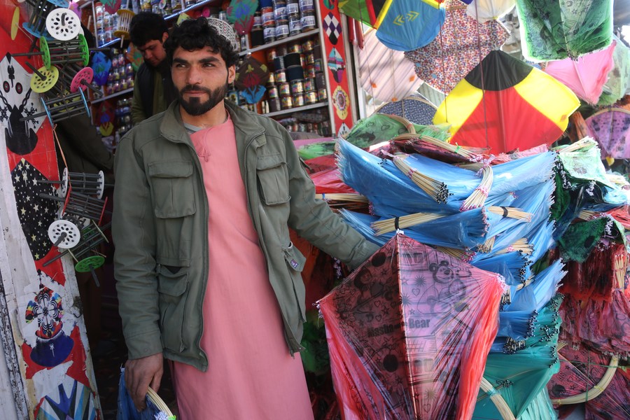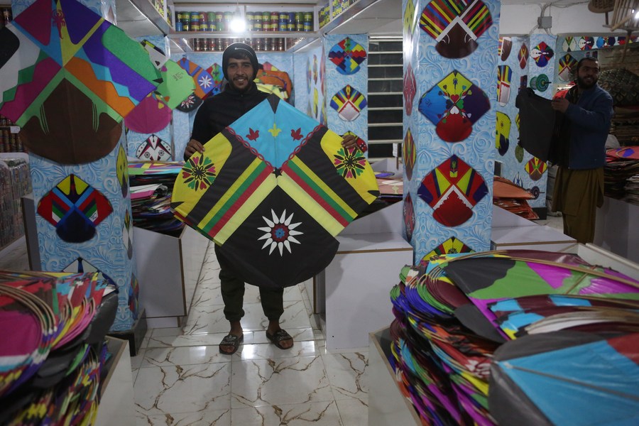 An Afghan man holds kites at a bazaar in Kabul, capital of Afghanistan, Feb. 24, 2024. (Photo by Saifurahman Safi/Xinhua)
