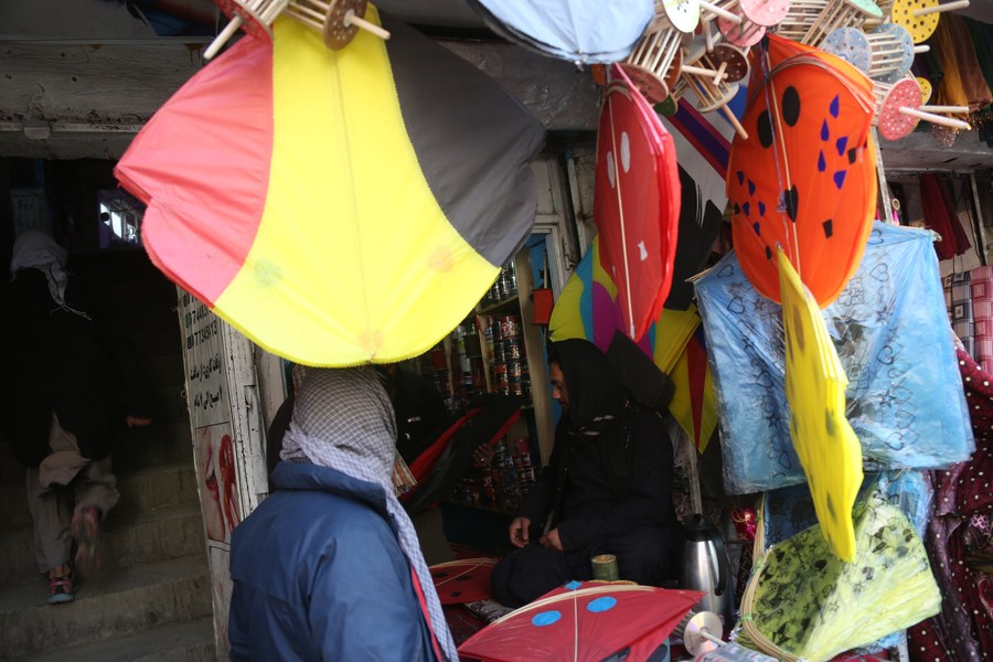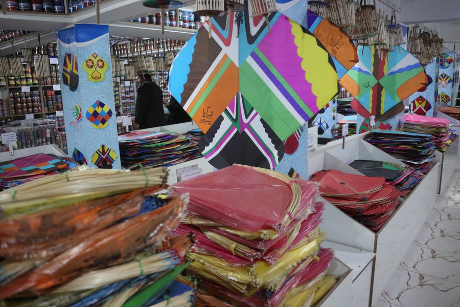 Photo taken on Feb. 24, 2024 shows beautiful kites at a bazaar in Kabul, capital of Afghanistan. (Photo by Saifurahman Safi/Xinhua)