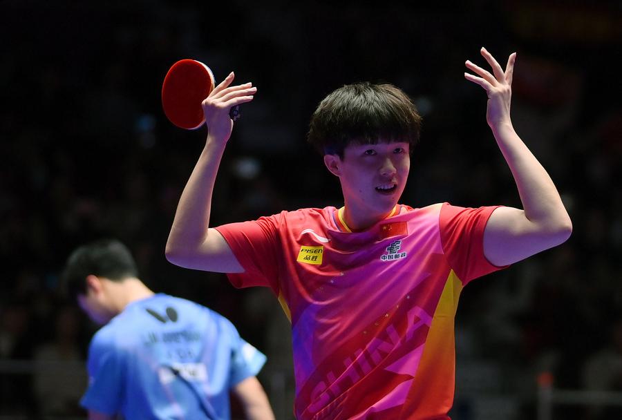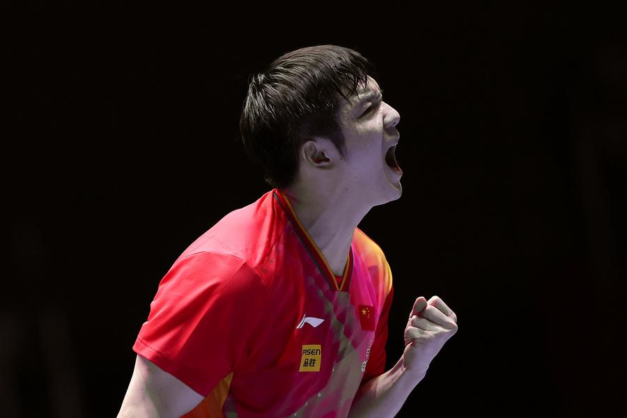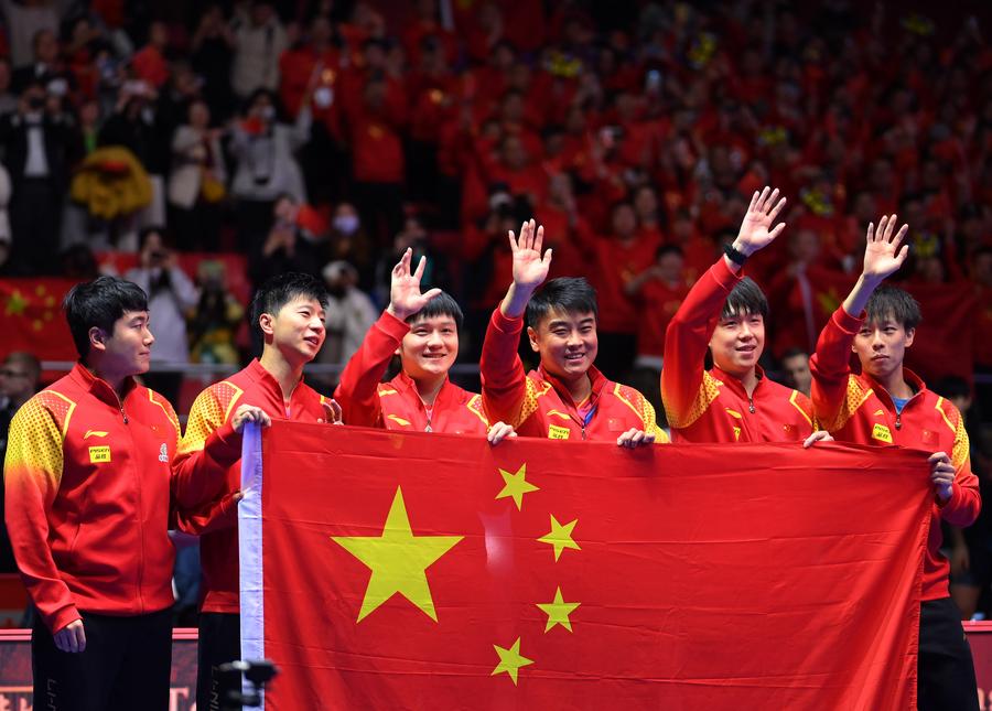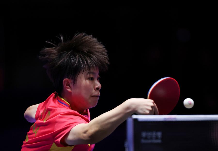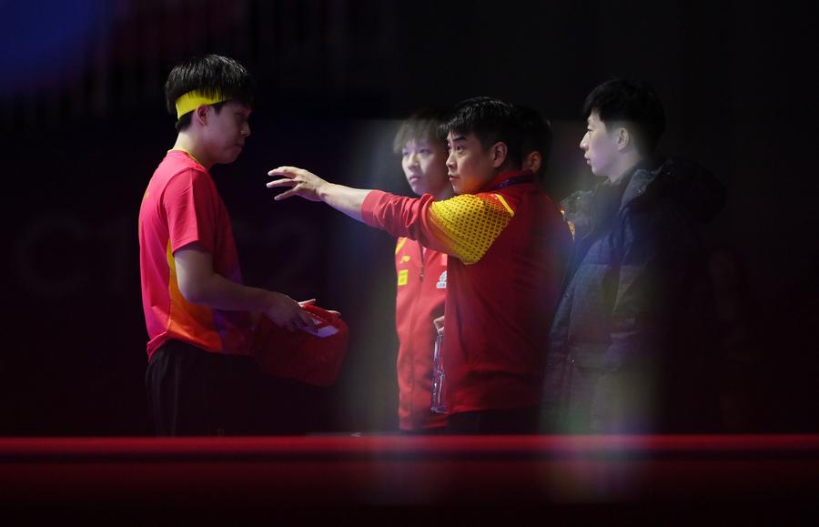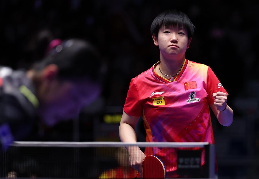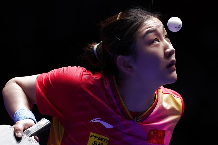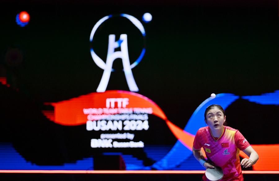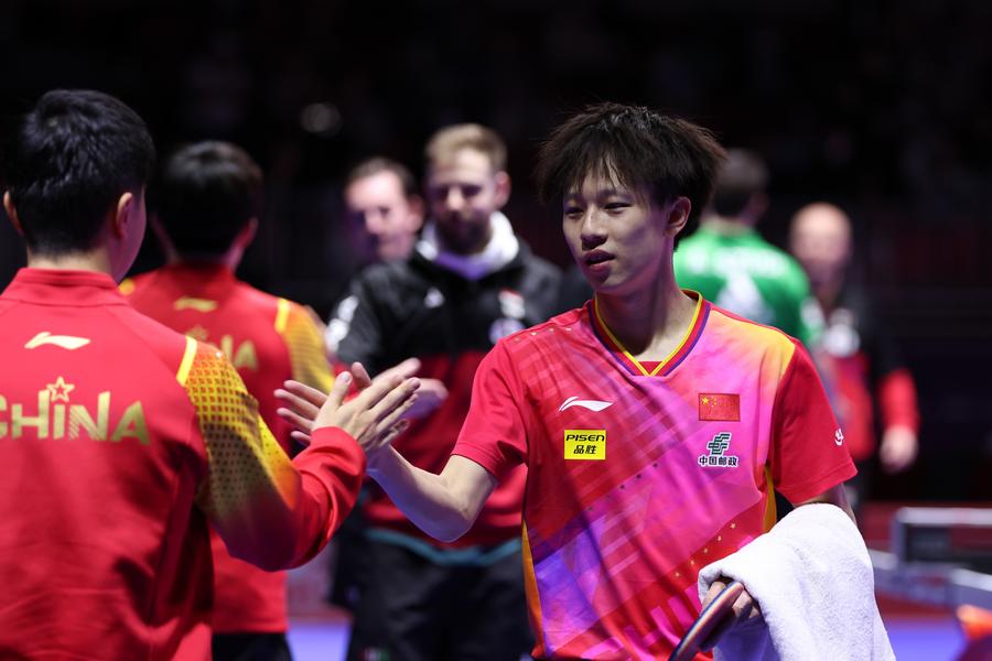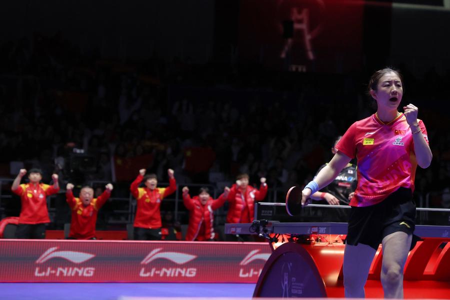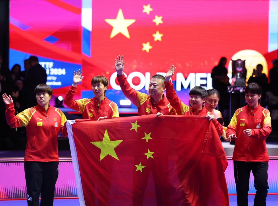 Team China celebrate with the trophy during the awarding ceremony for the men's team at the ITTF World Team Table Tennis Championships Finals Busan 2024 in Busan, South Korea, Feb. 25, 2024. (Xinhua/Yang Shiyao)Gold medalists team China pose with the trophy during the awarding ceremony for the women's team at the ITTF World Team Table Tennis Championships Finals Busan 2024 in Busan, South Korea, Feb. 24, 2024. (Xinhua/Yao Qilin)Sun Yingsha of China serves against Ayhika Mukherjee of India during the women's teams group stage match between China and India at the 2024 ITTF World Team Table Tennis Championships Finals in Busan, South Korea, Feb. 16, 2024. (Xinhua/Zhang Tao)Sun Yingsha of China reacts after losing the match against Ayhika Mukherjee of India during the women's teams group stage match between China and India at the 2024 ITTF World Team Table Tennis Championships Finals in Busan, South Korea, Feb. 16, 2024. (Xinhua/Tao Xiyi)Chen Meng of China returns the ball to Rimma Gufranova of Uzbekistan during the women's team Group 1 match between China and Uzbekistan at the ITTF World Team Table Tennis Championships Finals Busan 2024 in Busan, South Korea, Feb. 17, 2024. (Xinhua/Tao Xiyi)Chen Meng of China returns the ball to Sofia-Xuan Zhang of Spain during the women's team Group 1 match between China and Spain at the ITTF World Team Table Tennis Championships Finals Busan 2024 in Busan, South Korea, Feb. 18, 2024. (Xinhua/Zhang Tao)Sun Yingsha of China competes against Mercedes Nagyvarad of Hungary during the women's team Group 1 match between China and Hungary at the ITTF World Team Table Tennis Championships Finals Busan 2024 in Busan, South Korea, Feb. 19, 2024. (Xinhua/Tao Xiyi)Wang Yidi of China competes against Orawan Paranang of Thailand during the women's team round of 16 match between China and Thailand at the ITTF World Team Table Tennis Championships Finals Busan 2024 in Busan, South Korea, Feb. 21, 2024. (Xinhua/Yao Qilin)Sun Yingsha (L) and Chen Meng of China react during the women's team quarterfinal at the ITTF World Team Table Tennis Championships Finals Busan 2024 in Busan, South Korea, Feb. 22, 2024. (Xinhua/Tao Xiyi)Sun Yingsha of China and Lee Zion of South Korea compete during the women's team quarterfinal at the ITTF World Team Table Tennis Championships Finals Busan 2024 in Busan, South Korea, Feb. 22, 2024. (Xinhua/Tao Xiyi)Team China celebrate winning the women's team quarterfinal against South Korea at the ITTF World Team Table Tennis Championships Finals Busan 2024 in Busan, South Korea, Feb. 22, 2024. (Xinhua/Tao Xiyi)Chen Meng of China serves the ball to Hayata Hina of Japan during the women's team final match between China and Japan at the ITTF World Team Table Tennis Championships Finals Busan 2024 in Busan, South Korea, Feb. 24, 2024. (Xinhua/Zhang Tao)Sun Yingsha of China celebrates after winning the match against Harimoto Miwa of Japan during the women's team final match between China and Japan at the ITTF World Team Table Tennis Championships Finals Busan 2024 in Busan, South Korea, Feb. 24, 2024. (Xinhua/Zhang Tao)Team China celebrate winning the women's team final match between China and Japan at the ITTF World Team Table Tennis Championships Finals Busan 2024 in Busan, South Korea, Feb. 24, 2024. (Xinhua/Zhang Tao)Chen Meng of China celebrates after winning the match against Harimoto Miwa of Japan during the women's team final match between China and Japan at the ITTF World Team Table Tennis Championships Finals Busan 2024 in Busan, South Korea, Feb. 24, 2024. (Xinhua/Zhang Tao)Team China celebrate after winning the women's team final match between China and Japan at the ITTF World Team Table Tennis Championships Finals Busan 2024 in Busan, South Korea, Feb. 24, 2024. (Xinhua/Yang Shiyao)Ma Long of China competes against Martin Allegro of Belgium during the men's teams group stage match at the 2024 ITTF World Team Table Tennis Championships Finals in Busan, South Korea, Feb. 16, 2024. (Xinhua/Yang Shiyao)Ma Long of China competes against Martin Allegro of Belgium during the men's teams group stage match at the 2024 ITTF World Team Table Tennis Championships Finals in Busan, South Korea, Feb. 16, 2024. (Xinhua/Zhang Tao)Fan Zhendong of China competes against Cedric Nuytinck of Belgium during the men's teams group stage match at the 2024 ITTF World Team Table Tennis Championships Finals in Busan, South Korea, Feb. 16, 2024. (Xinhua/Yang Shiyao)Lin Gaoyuan of China celebrates after defeating Adam Szudi of Hungary during the men's team Group 1 match between China and Hungary at the ITTF World Team Table Tennis Championships Finals Busan 2024 in Busan, South Korea, Feb. 18, 2024. (Xinhua/Zhang Tao)Liang Jingkun of China competes against Tamas Lakatos of Hungary during the men's team Group 1 match between China and Hungary at the ITTF World Team Table Tennis Championships Finals Busan 2024 in Busan, South Korea, Feb. 18, 2024. (Xinhua/Zhang Tao)Wang Chuqin of China competes against Filip Zeljko of Croatia during the men's team Group 1 match between China and Croatia at the ITTF World Team Table Tennis Championships Finals Busan 2024 in Busan, South Korea, Feb. 19, 2024. (Xinhua/Zhang Tao)Fan Zhendong of China competes against Tomislav Pucar of Croatia during the men's team Group 1 match between China and Croatia at the ITTF World Team Table Tennis Championships Finals Busan 2024 in Busan, South Korea, Feb. 19, 2024. (Xinhua/Zhang Tao)Wang Chuqin of China competes against Ovidiu Ionescu of Romania during the men's team round of 16 match at the ITTF World Team Table Tennis Championships Finals Busan 2024 in Busan, South Korea, Feb. 21, 2024. (Xinhua/Tao Xiyi)Coach Wang Hao (3rd L) of China gives instructions to player Wang Chuqin (1st L) during the men's team round of 16 match at the ITTF World Team Table Tennis Championships Finals Busan 2024 in Busan, South Korea, Feb. 21, 2024. (Xinhua/Tao Xiyi)Wang Chuqin (front) of China walks to the table after a pau