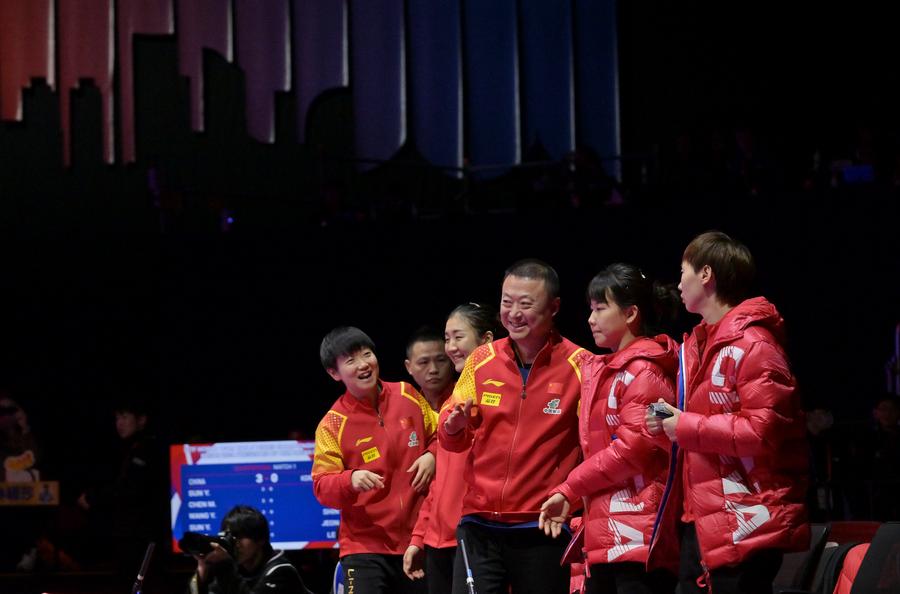 BUSAN, South Korea, Feb. 26 (Xinhua) --China's title defense at the ITTF World Team Table Tennis Championships Finals concluded in Busan, South Korea, on Sunday. China cruised past France 3-0 to claim its 11th consecutive men's title and rallied past Japan 3-2 to claim its sixth consecutive women's title.