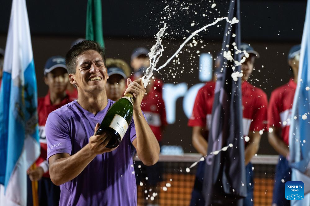 Sebastian Baez of Argentina celebrates with champagne during the awarding ceremony after the men's singles final between Sebastian Baez of Argentina and Mariano Navone of Argentina at the 2024 ATP500 Rio Open at Jockey Club Brasileiro in Rio de Janeiro, Brazil, Feb. 25, 2024. (Xinhua/Wang Tiancong)