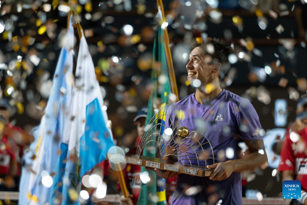 Sebastian Baez holds up the trophy during the men's singles final between Sebastian Baez of Argentina and Mariano Navone of Argentina at the 2024 ATP500 Rio Open at Jockey Club Brasileiro in Rio de Janeiro, Brazil, Feb. 25, 2024. (Xinhua/Wang Tiancong)