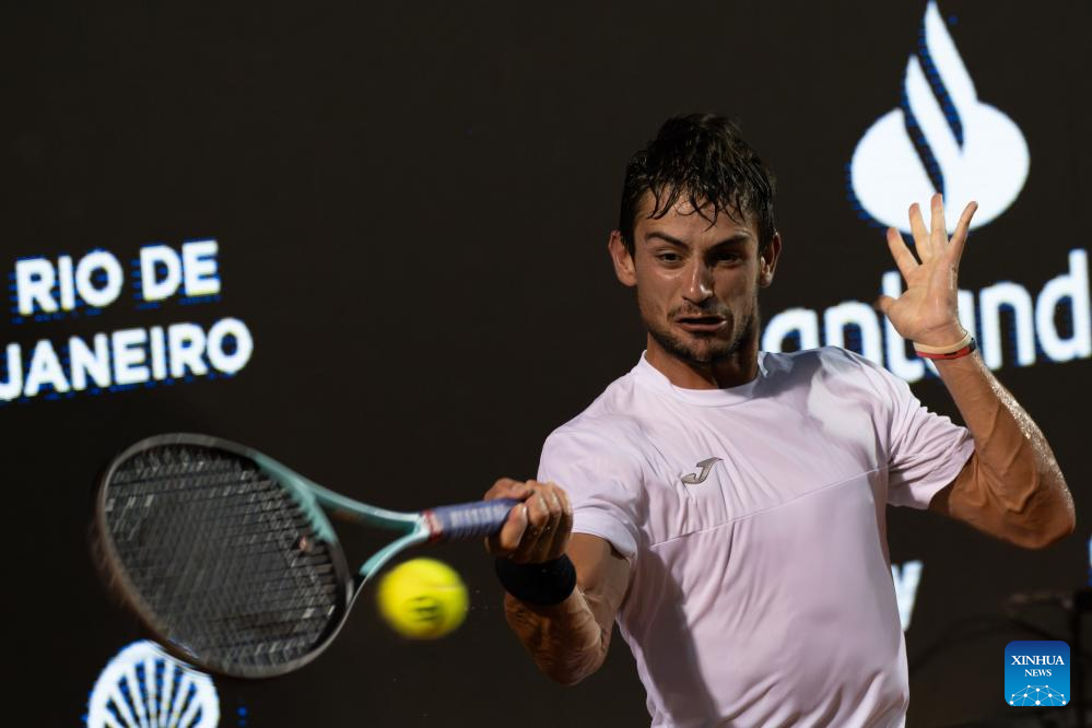 Mariano Navone of Argentina hits a return during the men's singles final between Sebastian Baez of Argentina and Mariano Navone of Argentina at the 2024 ATP500 Rio Open at Jockey Club Brasileiro in Rio de Janeiro, Brazil, Feb. 25, 2024. (Xinhua/Wang Tiancong)