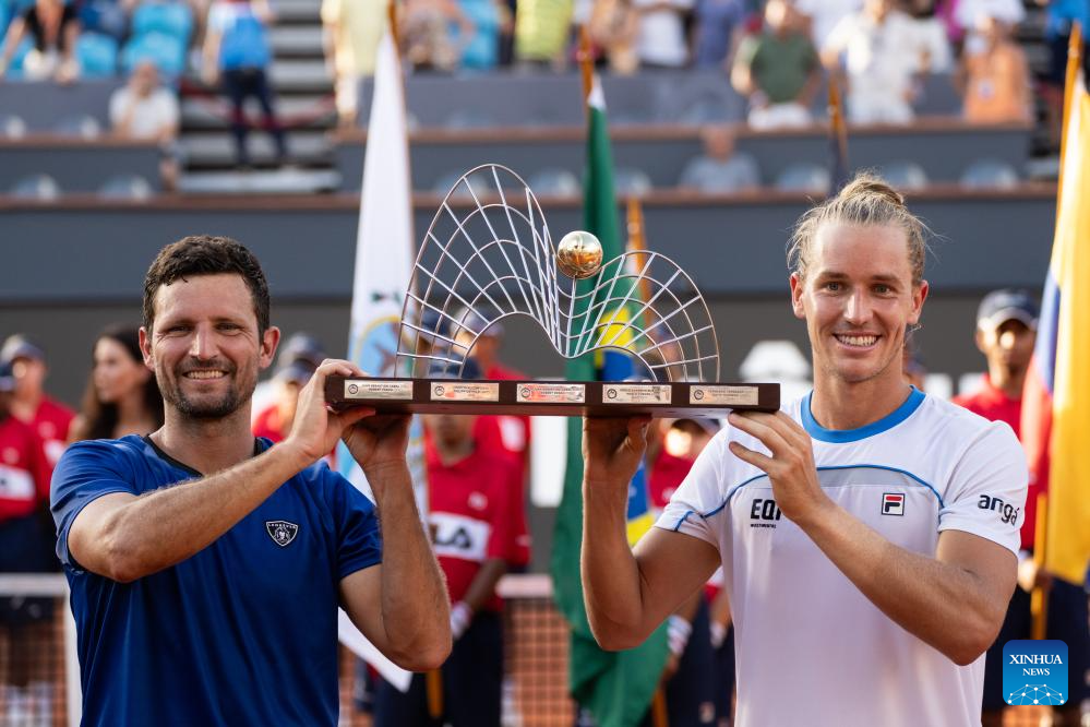 Nicolas Barrientos (L) of Colombia/Rafael Matos of Brazil hold up the trophy during the awarding ceremony after the men's doubles final between Lucas Miedler/Alexander Erler of Austria and Nicolas Barrientos of Colombia/Rafael Matos of Brazil at the 2024 ATP500 Rio Open at Jockey Club Brasileiro in Rio de Janeiro, Brazil, Feb. 25, 2024. (Xinhua/Wang Tiancong)