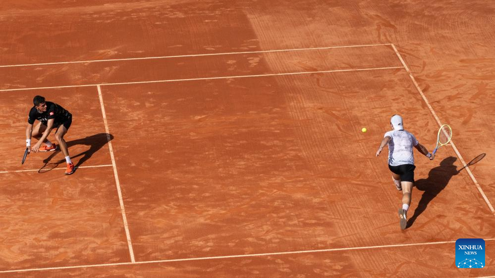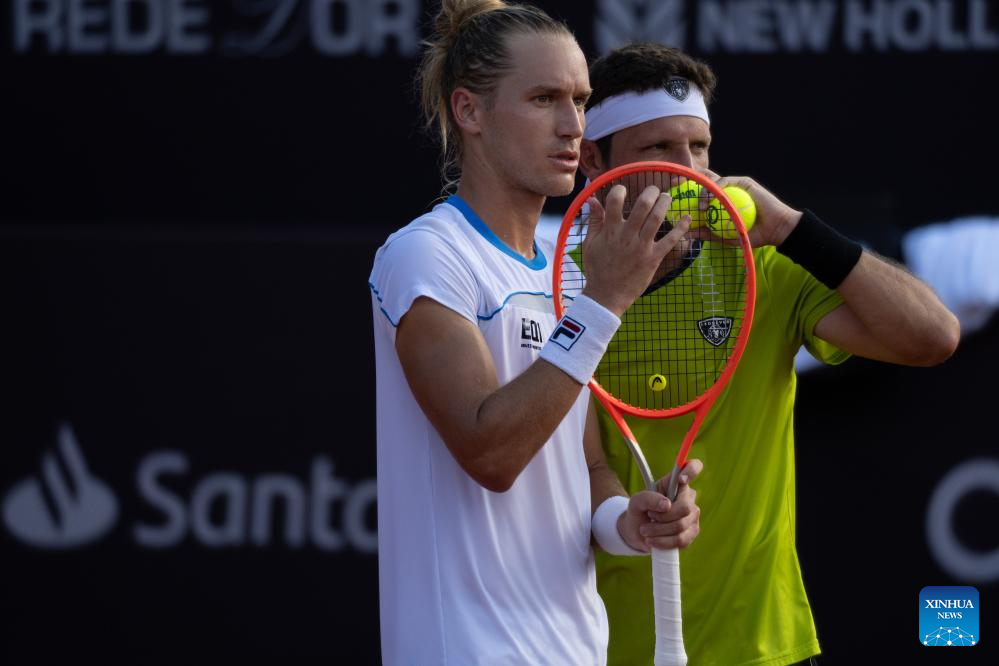 Lucas Miedler (R) and Alexander Erler of Austria compete during the men's doubles final between Lucas Miedler/Alexander Erler of Austria and Nicolas Barrientos of Colombia/Rafael Matos of Brazil at the 2024 ATP500 Rio Open at Jockey Club Brasileiro in Rio de Janeiro, Brazil, Feb. 25, 2024. (Xinhua/Wang Tiancong)