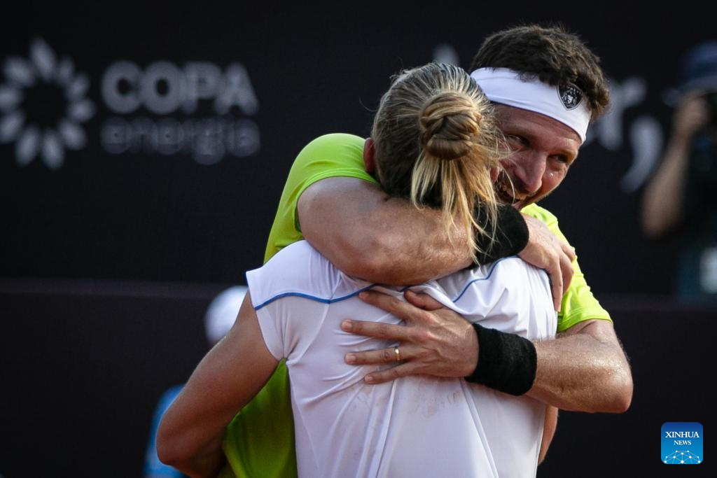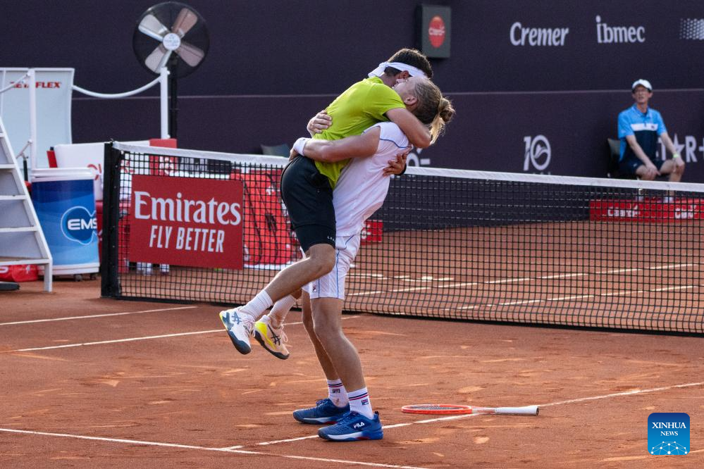 Nicolas Barrientos (L) of Colombia /Rafael Matos of Brazil celebrate victory after the men's doubles final between Lucas Miedler/Alexander Erler of Austria and Nicolas Barrientos of Colombia/Rafael Matos of Brazil at the 2024 ATP500 Rio Open at Jockey Club Brasileiro in Rio de Janeiro, Brazil, Feb. 25, 2024. (Xinhua/Wang Tiancong)