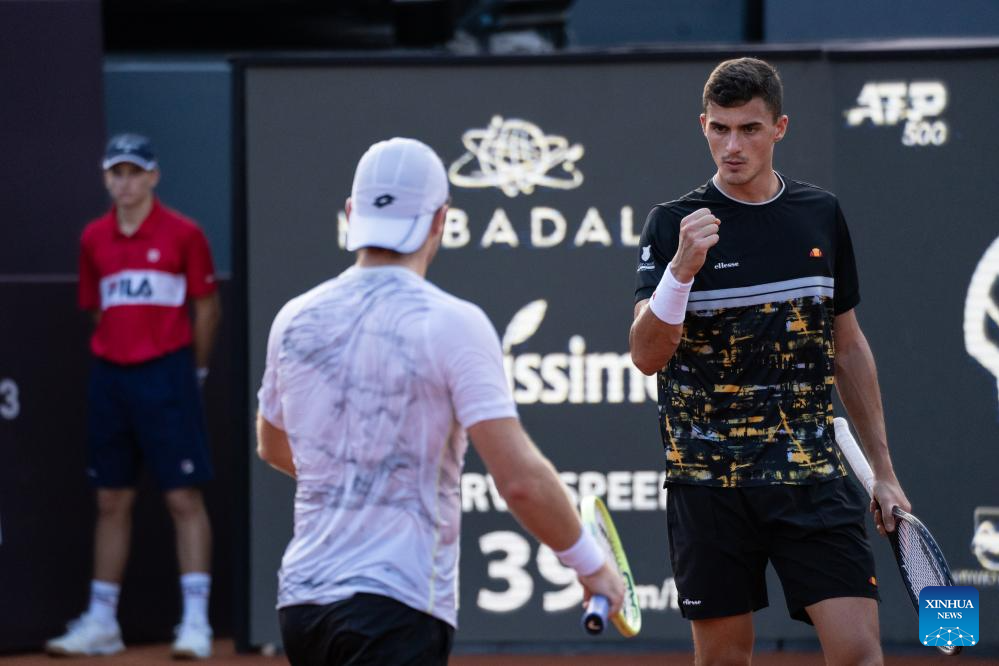 Nicolas Barrientos (R) of Colombia/Rafael Matos of Brazil react during the men's doubles final between Lucas Miedler/Alexander Erler of Austria and Nicolas Barrientos of Colombia/Rafael Matos of Brazil at the 2024 ATP500 Rio Open at Jockey Club Brasileiro in Rio de Janeiro, Brazil, Feb. 25, 2024. (Xinhua/Wang Tiancong)