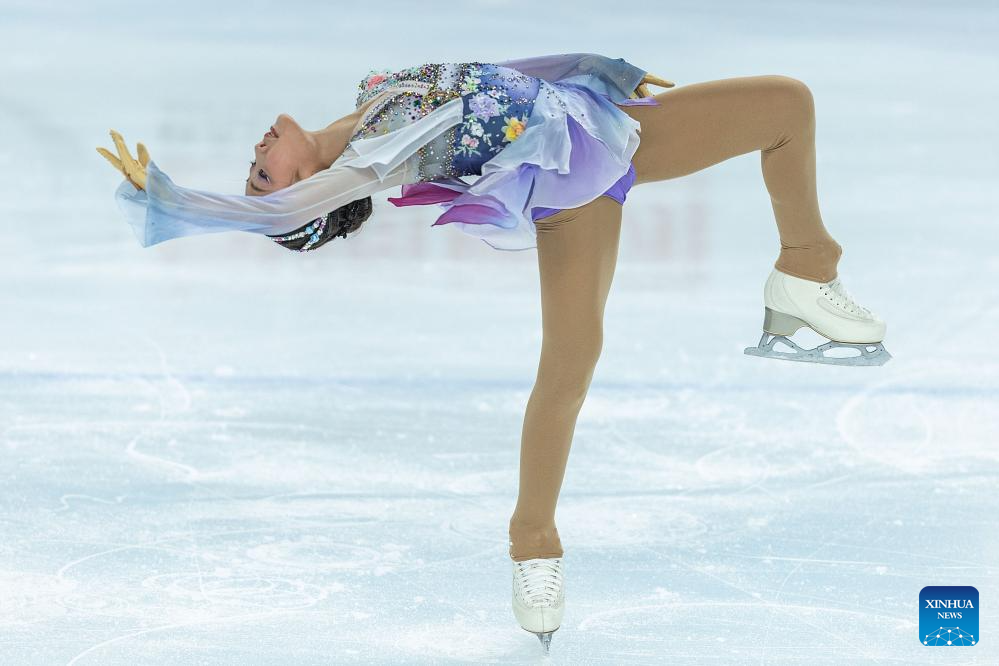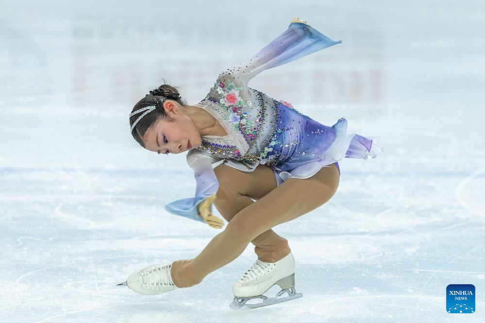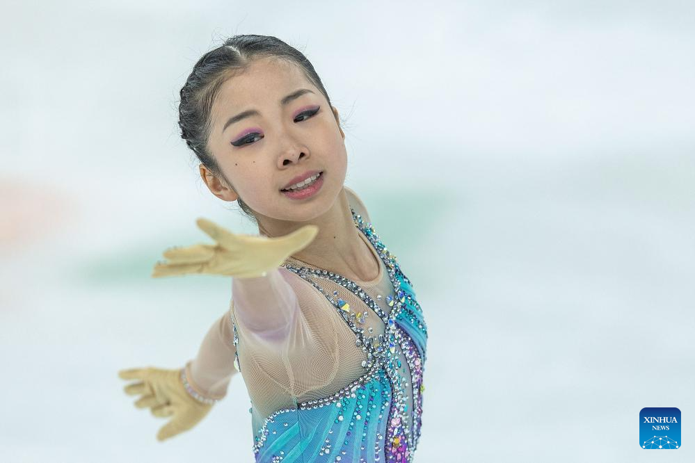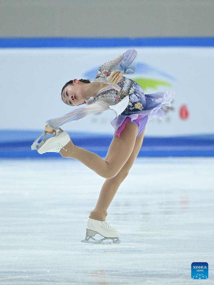 An Xiangyi of Beijing performs during the women single free skating of figure skating event at China's 14th National Winter Games in Hulun Buir, north China's Inner Mongolia Autonomous Region, Feb. 25, 2024. (Xinhua/Huang Wei)