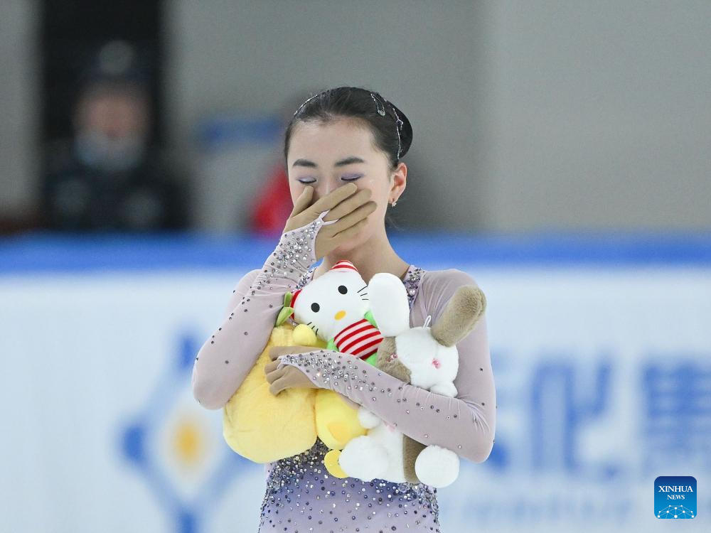 Zhang Mengqi of Jilin reacts after her performance during the women single free skating of figure skating event at China's 14th National Winter Games in Hulun Buir, north China's Inner Mongolia Autonomous Region, Feb. 25, 2024. (Xinhua/Xu Bingjie)