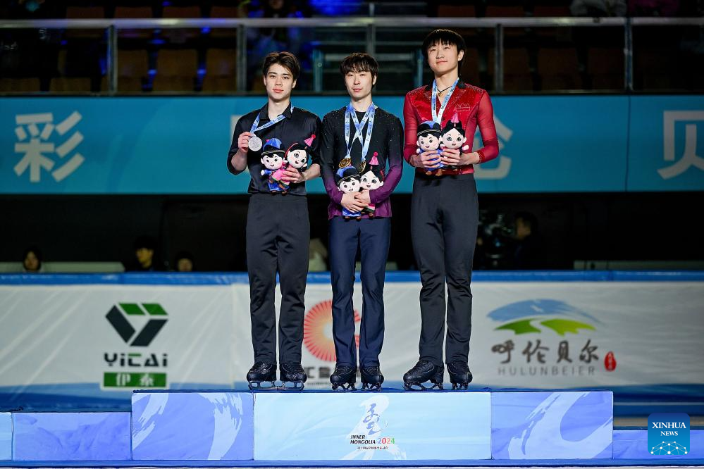 Gold medalist Jin Boyang (C) of Beijing, silver medalist Dai Dawei (L) of Guangdong and bronze medalist Han Wenbao of Heilongjiang pose for photograph during the awarding ceremony of the men single free skaing of figure skating event at the China's 14th National Winter Games in Hulun Buir, north China's Inner Mongolia Autonomous Region, Feb. 26, 2024. (Xinhua/Lian Zhen)