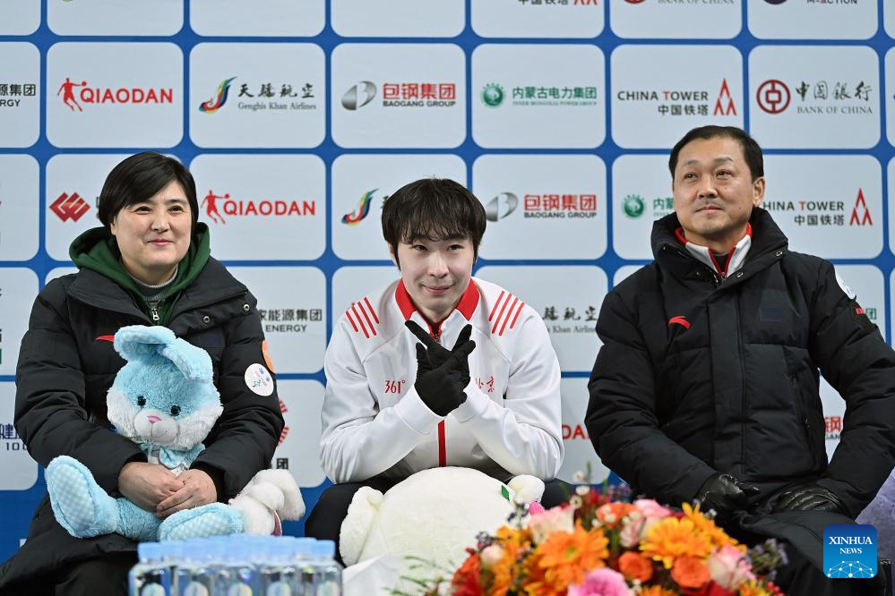 Jin Boyang (C) of Beijing gestures as he waits for his final result during the men single free skaing of figure skating event at the China's 14th National Winter Games in Hulun Buir, north China's Inner Mongolia Autonomous Region, Feb. 26, 2024. (Xinhua/Xu Bingjie)