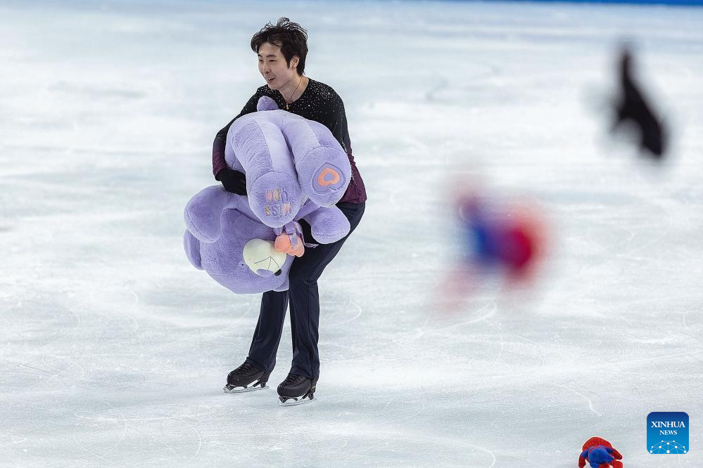 Jin Boyang of Beijing takes one toy after his performance during the men single free skaing of figure skating event at the China's 14th National Winter Games in Hulun Buir, north China's Inner Mongolia Autonomous Region, Feb. 26, 2024. (Xinhua/Huang Wei)