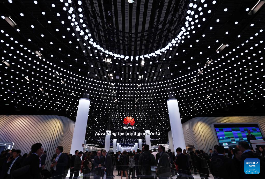 People visit the Huawei booth during the Mobile World Congress (MWC) in Barcelona, Spain, Feb. 26, 2024. The 2024 edition of the MWC, the world's leading trade fair for mobile technology and related industries, opened in Barcelona, Spain, on Monday. This year's MWC features around 2,400 exhibitors and 1,100 speakers, including nearly 300 Chinese companies such as China Mobile, China Telecom, Huawei, ZTE, Lenovo, Xiaomi and iFlytek. (Xinhua/Gao Jing)