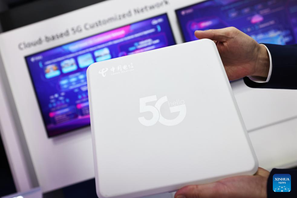 A staff member shows a China Telecom 5G antenna during the Mobile World Congress (MWC) in Barcelona, Spain, Feb. 27, 2024. The 2024 edition of the MWC, the world's leading trade fair for mobile technology and related industries, opened in Barcelona, Spain, on Monday. This year's MWC features around 2,400 exhibitors and 1,100 speakers, including nearly 300 Chinese companies such as China Mobile, China Telecom, Huawei, ZTE, Lenovo, Xiaomi and iFlytek. (Xinhua/Gao Jing)