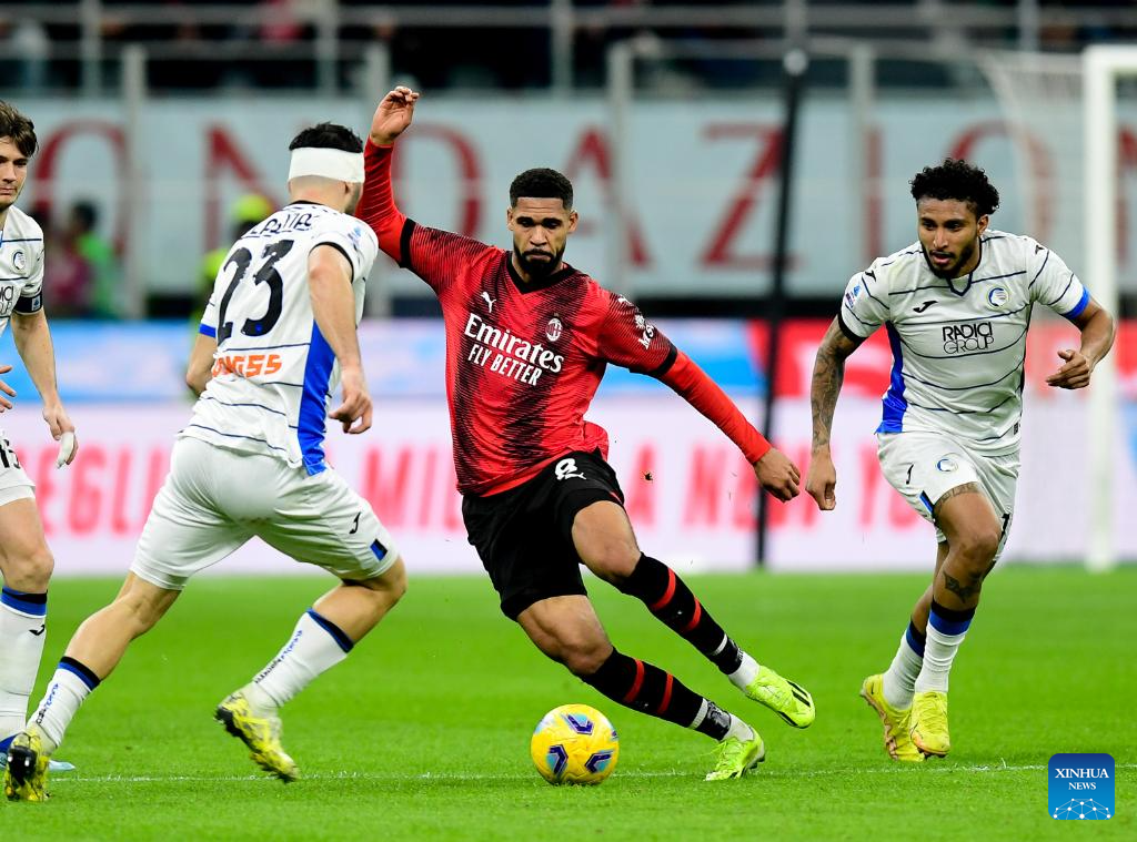 AC Milan's Ruben Loftus-Cheek (C) vies during a Serie A football match between Milan and Atalanta in Milan, Italy, Feb. 25, 2024. (Photo by Valeria Abis/Xinhua)