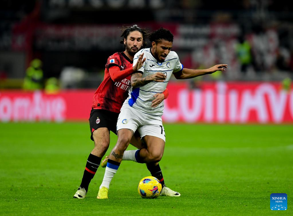 AC Milan's Yacine Adli (L) vies with Atalanta's Ederson during a Serie A football match between Milan and Atalanta in Milan, Italy, Feb. 25, 2024. (Photo by Valeria Abis/Xinhua)