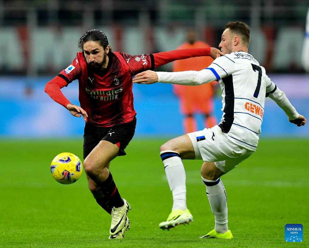 AC Milan's Yacine Adli (L) vies with Atalanta's Teun Koopmeiners during a Serie A football match between Milan and Atalanta in Milan, Italy, Feb. 25, 2024. (Photo by Valeria Abis/Xinhua)