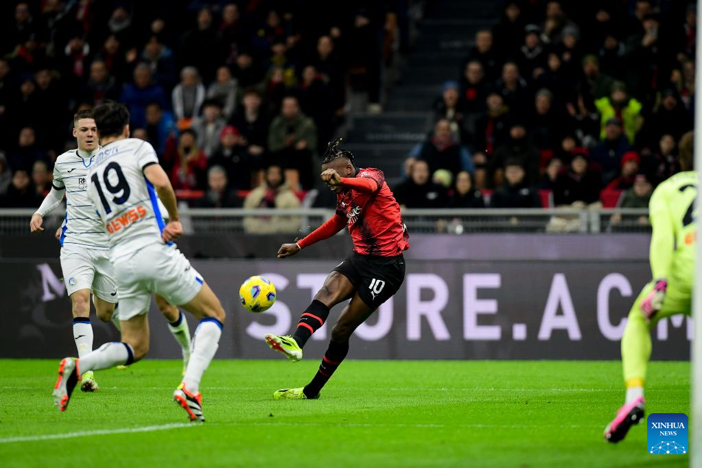 AC Milan's Rafael Leao (R) scores his goal during a Serie A football match between Milan and Atalanta in Milan, Italy, Feb. 25, 2024. (Photo by Valeria Abis/Xinhua)