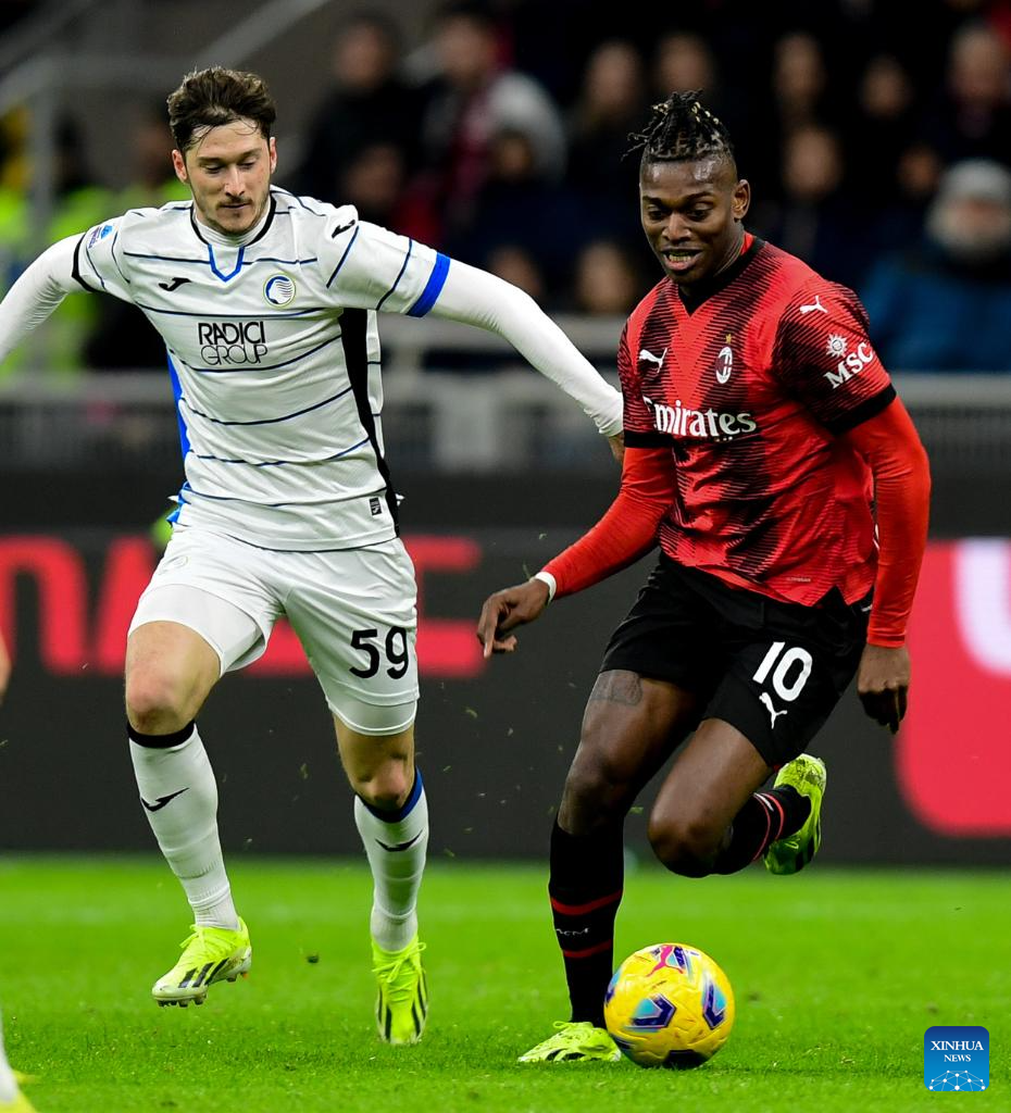 AC Milan's Rafael Leao (R) vies with Atalanta's Aleksej Miranchuk during a Serie A football match between Milan and Atalanta in Milan, Italy, Feb. 25, 2024. (Photo by Valeria Abis/Xinhua)