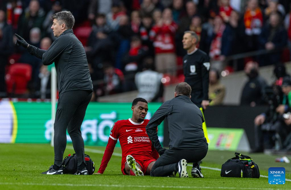 (240226) -- LONDON, Feb. 26, 2024 (Xinhua) Liverpool's Ryan Gravenberch is treated for an injury during the English Football League Cup final match between Chelsea and Liverpool in London, Britain, on Feb. 25, 2024. (Xinhua)