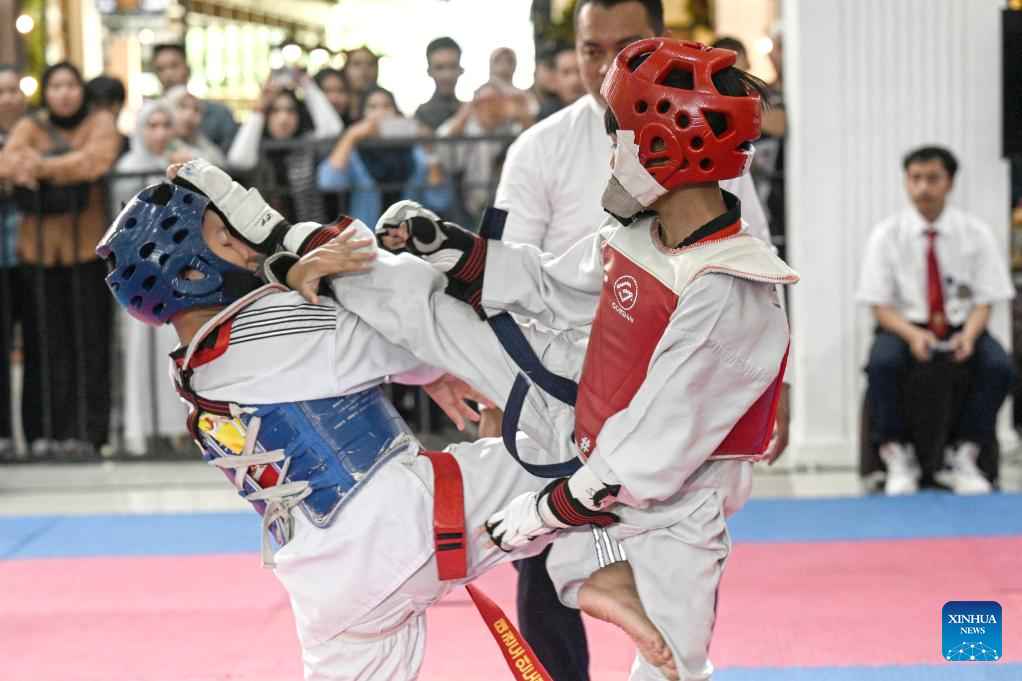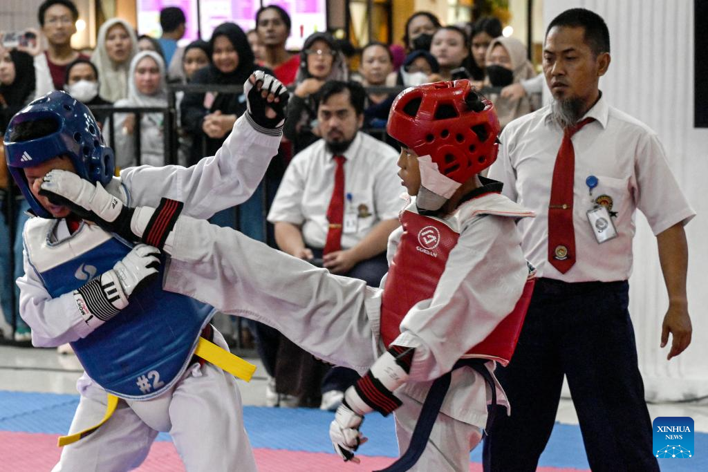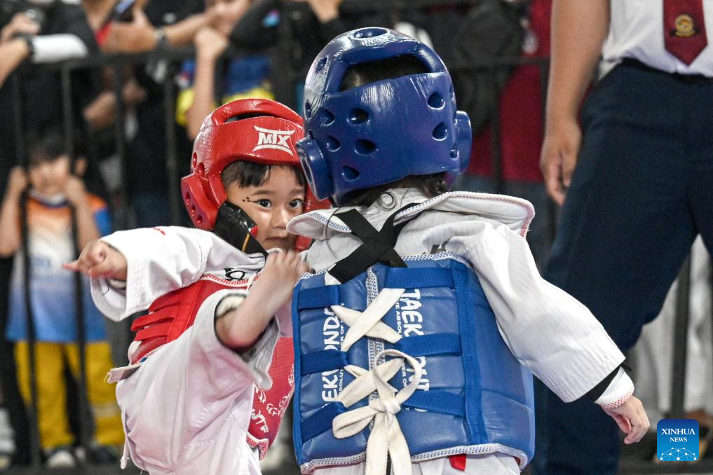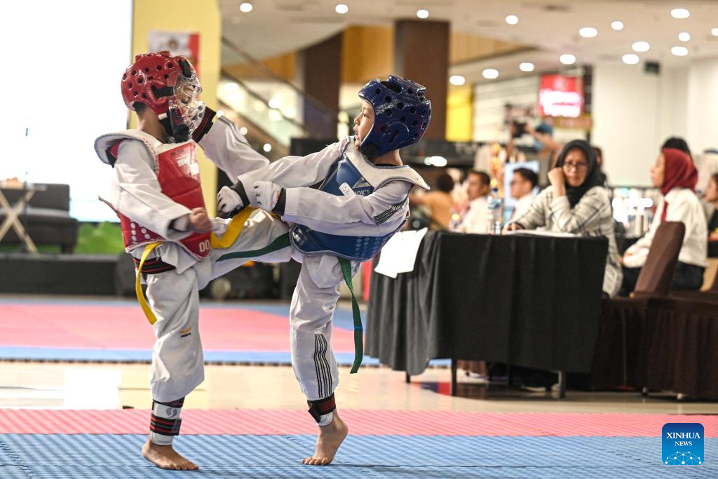 Children compete in boys class on Kyorugi category during a regional taekwondo kids championship in South Tangerang, Banten Province, Indonesia, on Feb. 25, 2024. (Xinhua/Agung Kuncahya B.)