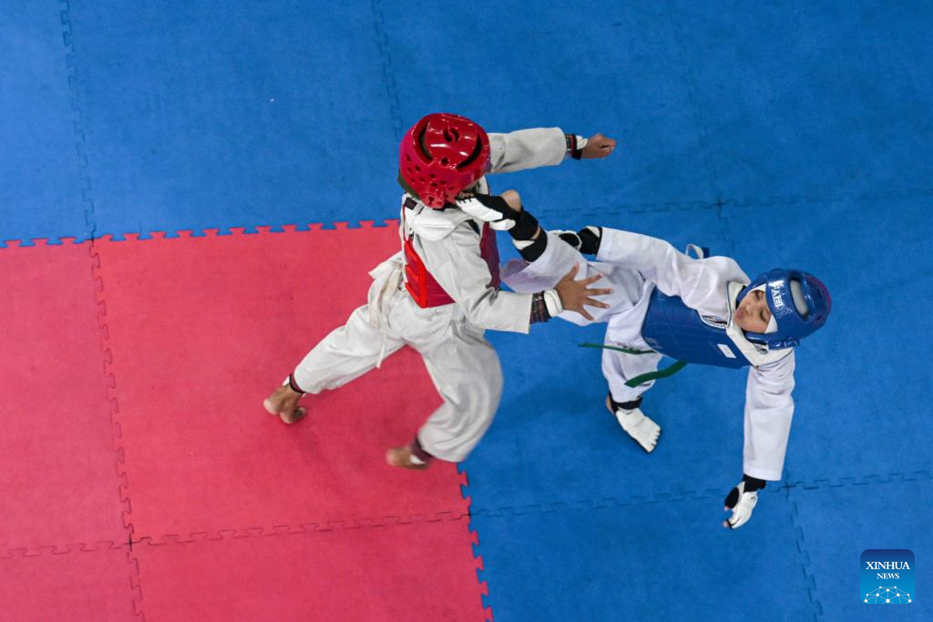 Children compete in girls class on Kyorugi category during a regional taekwondo kids championship in South Tangerang, Banten Province, Indonesia, on Feb. 25, 2024. (Xinhua/Agung Kuncahya B.)