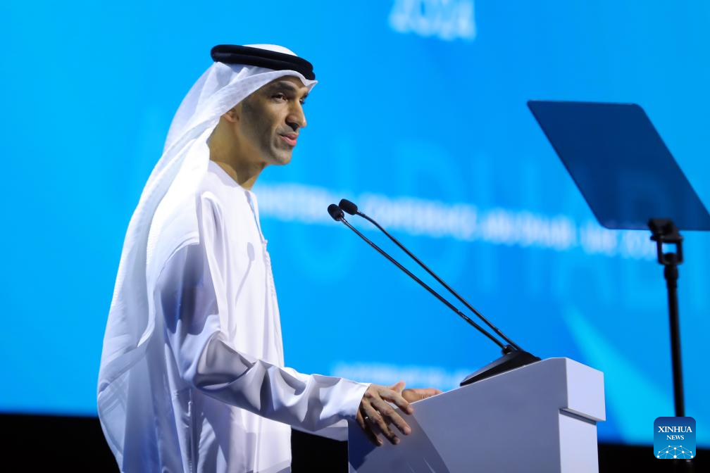 The United Arab Emirates's Minister of State for Foreign Trade Thani bin Ahmed Al Zeyoudi speaks during the opening ceremony of the 13th Ministerial Conference (MC13) of the World Trade Organization (WTO) in Abu Dhabi, the United Arab Emirates, Feb. 26, 2024. The four-day MC13 of WTO kicked off here on Monday in the capital of the United Arab Emirates with ministers of economy, trade, and development from various countries, as well as representatives from global economic and trade organizations attending the event. (WTO/Handout via Xinhua)