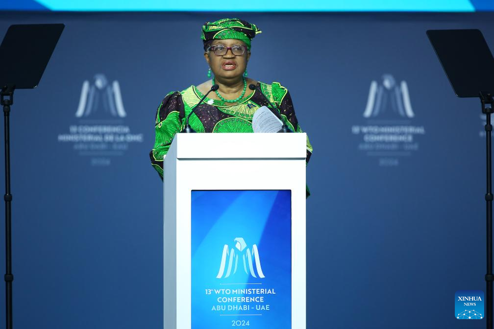 Director-General of the World Trade Organization (WTO) Ngozi Okonjo-Iweala speaks during the opening ceremony of the 13th Ministerial Conference (MC13) of WTO in Abu Dhabi, the United Arab Emirates, Feb. 26, 2024. The four-day MC13 of WTO kicked off here on Monday in the capital of the United Arab Emirates with ministers of economy, trade, and development from various countries, as well as representatives from global economic and trade organizations attending the event. (WTO/Handout via Xinhua)